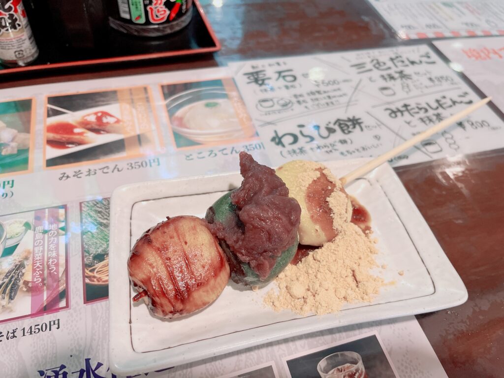 名物の三色だんごと、湧き水で淹れたアイスコーヒーをいただきました☕